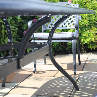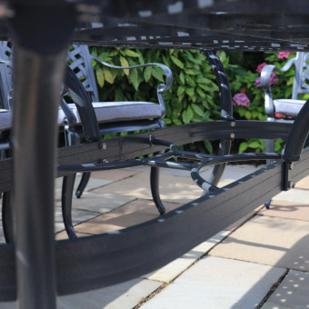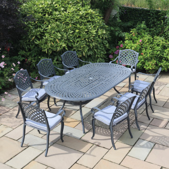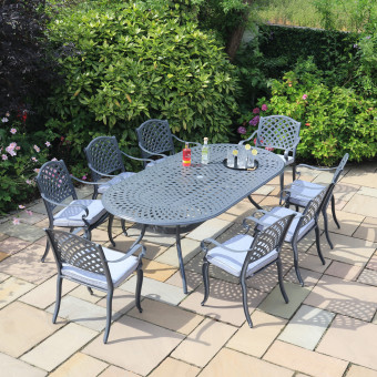 Introducing the Fitzhenry - 8 Seat Set with Oval Table in a sophisticated Hammered Grey finish – a testament to durability, practicality, and timeless style. This cast aluminium outdoor dining ensemble effortlessly enhances your outdoor space, offering a perfect blend of resilience and elegance. The hammered grey finish not only adds a contemporary touch but also ensures that the set remains resistant to rust, requiring minimal maintenance to keep it looking as stunning as the day it arrived.
