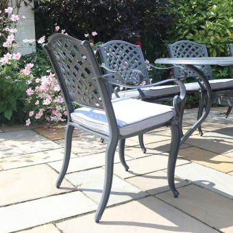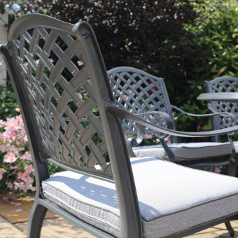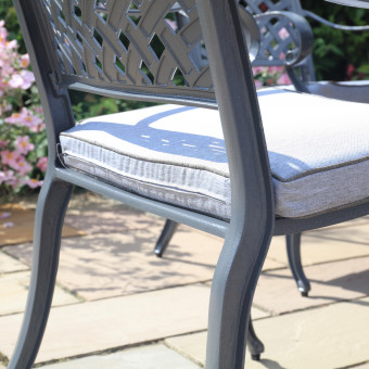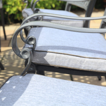 Designed for both practicality and comfort, the Fitzhenry set features a spacious oval table capable of seating eight guests comfortably. The stackable chairs offer convenient storage options, optimising space when not in use. The set comes complete with grey cushion covers that not only enhance comfort but also bring a touch of sophistication to your outdoor seating. Easy to maintain, the machine-washable cushion covers ensure that your outdoor retreat remains inviting and stylish, making the Fitzhenry - 8 Seat Set with Oval Table in Hammered Grey the ultimate choice for those who appreciate both form and function in their outdoor furniture.