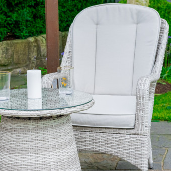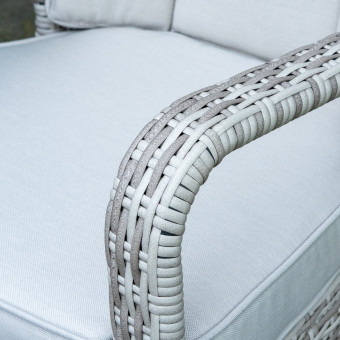 Our newest Parma range brings one of our most popular designs in a new white wash finish. This elegant dining ensemble comfortably seats two people, ensuring a cosy and enjoyable dining or lounging experience. The high-back chairs offer exceptional comfort with the extra padding on the base and back cushions and added lumbar support to cradle your upper body.